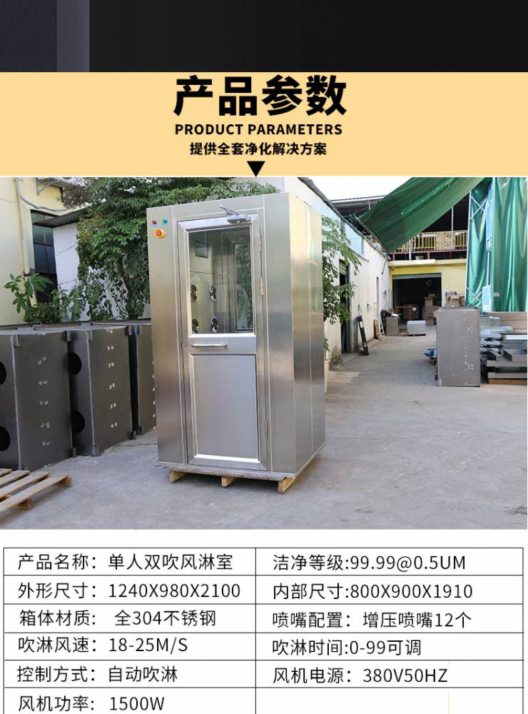 風淋室是一種通用性較強的局部凈化設備,安裝于潔凈室與非潔凈室之間。當人與貨物要進入潔凈區時需經風淋室吹淋,其吹出的潔凈空氣可去除人與貨物所攜帶的塵埃,能有效的阻斷或減少塵源進入潔凈區。風淋室/貨淋室的前后兩道門為電子互鎖,又可起到氣閘的作用,阻止未凈化的空氣進入潔凈區域。