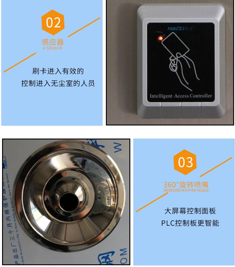 潔凈室內,在動態情況下,細菌及塵埃的發生源是操作者,當操作者進入潔凈室之前,必須用潔凈空氣吹淋其衣服表面附著的塵埃顆粒,并起到氣閘的作用。